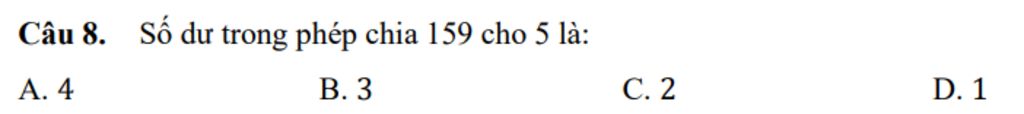 `=>` Số dư trong phép chia `159` cho `5` là: `4`