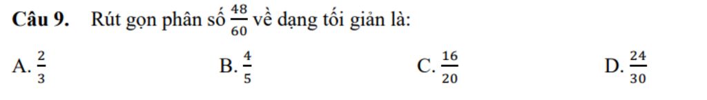 Giải thích: `48/60 = (48 : 12)/(60 : 12) = 4/5`