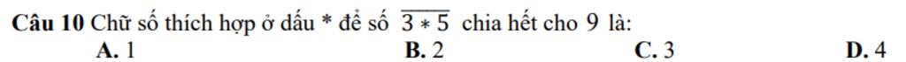 Ta sử dụng phương pháp thay các số của đáp án vào dấu * để tổng các chữ số của số này chia hết cho `9`