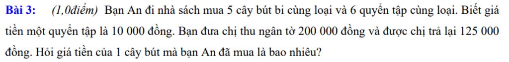Số tiền của một cây bút: (200 000 - 125 000 - 10 000 . 6) : 5 = 3 000 (đồng)