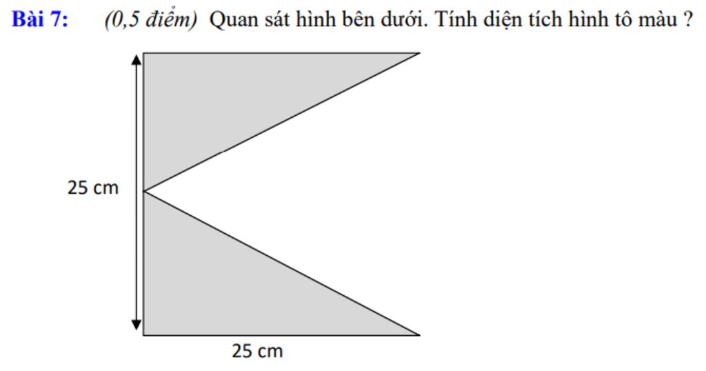 Diện tích hình tô màu: `(25 xx 25)/2 xx 25 = 625` (`cm^2`)