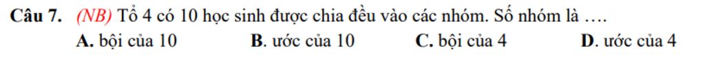 Vì tổ `4` có `10` học sinh được chia đều vào các nhóm nên ta có:
