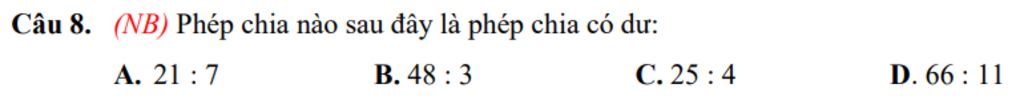 `25:4 = 6` `(dư` `1)` `->` Có dư