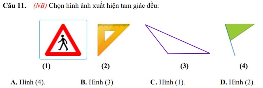 Theo hình vẽ, ta nhận thấy hình `(1)` là tam giác có `3` cạnh độ dài bằng nhau. Còn hình `(2); (3)` và `(4)` là tam giác có `3` cạnh độ dài không bằng nhau