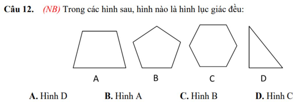 Câu 12. (NB) Trong các hình sau, hình nào là hình lục giác đều: