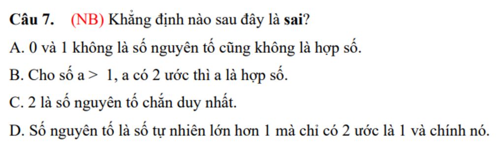 D. Số nguyên tố là số tự nhiên lớn hơn 1 mà chỉ có 2 ước là 1 và chính nó.