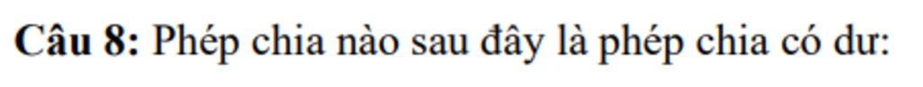 Câu 8: Phép chia nào sau đây là phép chia có dư: