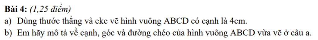 - Cạnh: AB = BC = CD = AD = 4cm
