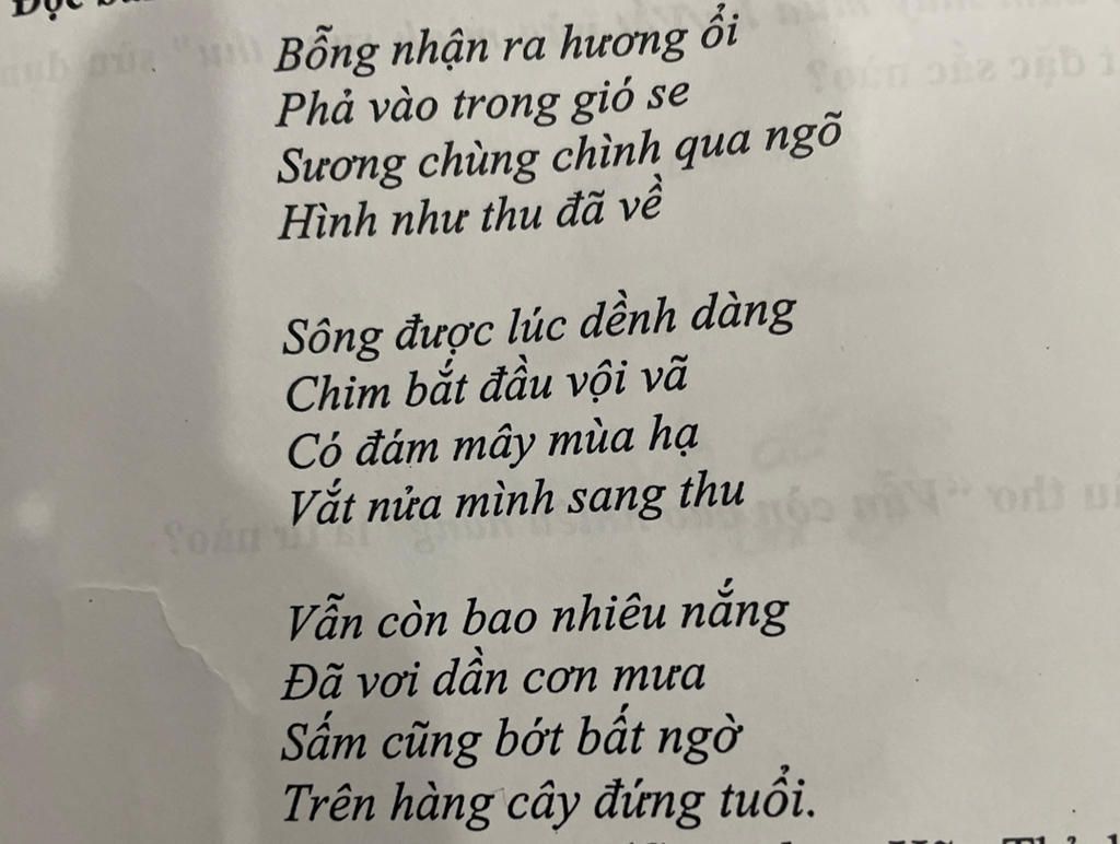 `->`$\text{Ý nghĩa :}$$\text{Câu thơ miêu tả sự chuyển mình của mùa hè sang mùa thu, khi cơn mưa}$$\\$$\text{ cũng như sấm sét giảm dầnvà những hàng cây đứng tuổi bắt đầu chuyển }$$\\$$\text{màu lá.điều ý cho thấy sự chuyển giao giữa 2 mùa và sự lặng lẽ,yên bình }$$\\$$\text{của mùa thu.Câu thơ cũng gợi về sự trưởng thành sẽ trải qua biết bao}$$\\$$\text{điều thì ta mới được một sự bình yên và trưởng thành.}$
