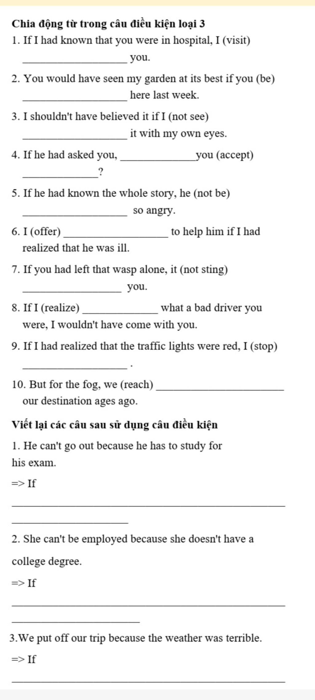 `-` Điều kiện loại 3 : If + S + had + PII, S + would/could + have + PII
