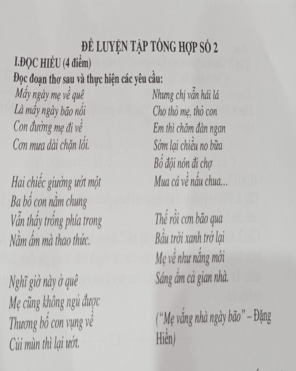 C2: Bài thơ "Mẹ vắng nhà ngày bão" là 1 tình huống độc đáo giúp t.giả thể hiện dc những cung bậc t.cảm của các t.viên trong gđình dành cho nhau. Từ nội dung bài thơ, em hãy viết 1 đoạn văn khoảng 6-8 câu để làm sáng tỏ điều đó