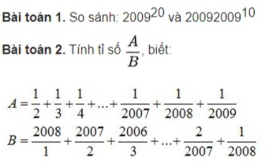 Ta có: $\dfrac{A}{B}=\dfrac{\dfrac{1}{2}+\dfrac{1}{3}+\dfrac{1}{4}+...+\dfrac{1}{2007}+\dfrac{1}{2008}+\dfrac{1}{2009}}{\dfrac{2008}{1}+\dfrac{2007}{2}+\dfrac{2006}{3}+...+\dfrac{2}{2007}+\dfrac{1}{2008}}$