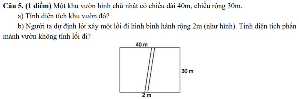 a) Diện tích khu vườn: `40 . 30 = 1200 (m^2)`