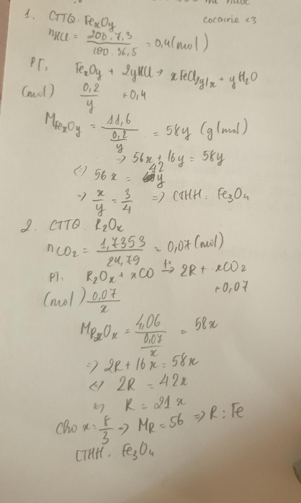 `->n_{Fe_xO_y}={n_{HCl}}/{2y}={0,2}/y(mol)`