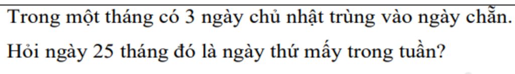 Ba ngày chủ nhật chẵn là: 2, 16, 30. Vậy ngày 25 là thứ Ba.