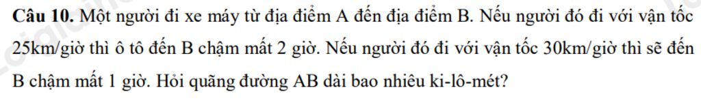 Giả sử người đó đi với vận tốc v1 = 25km/giờ và thời gian đi quãng đường AB tương ứng là t1; người đó đi với vận tốc v2 = 30km/giờ và thời gian đi quãng đường AB tương ứng là t2.