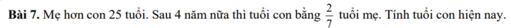 Tuổi con `4` năm sau: `25 : (7 – 2) xx 2 = 10` (tuổi)