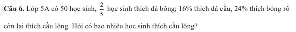 100% - (40% + 16% + 24%) = 20% (số học sinh cả lớp)