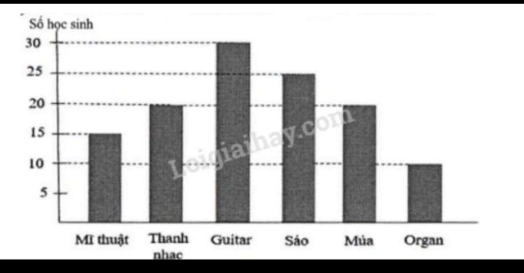 Câu 4. Biểu đồ cột dưới đây cho biết số lượng học sinh khối 6 tham gia câu lạc bộ nghệ thuật trong hè 2023 của trường THCS và THPT Nguyễn Tất Thành. Tỉ số phần trăm của số học sinh học Guitar so với tổng số học sinh tham gia câu lạc bộ nghệ thuật hè 2023 của trường THCS và THPT Nguyễn Tất Thành là: