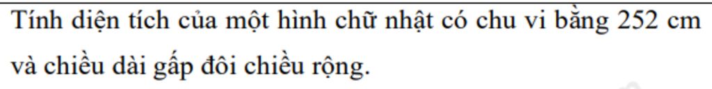 Tính diện tích của một hình chữ nhật có chu vi bằng 252 cm và chiều dài gấp đôi chiều rộng.