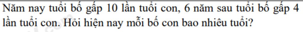 Năm nay tuổi bố gấp 10 lần tuổi con, 6 năm sau tuổi bố gấp 4 lần tuổi con. Hỏi hiện nay mỗi bố con bao nhiêu tuổi?