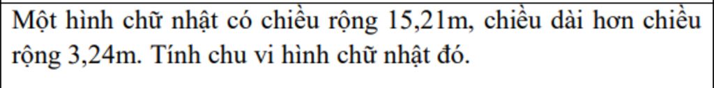 Một hình chữ nhật có chiều rộng 15,21m, chiều dài hơn chiều rộng 3,24m. Tính chu vi hình chữ nhật đó.