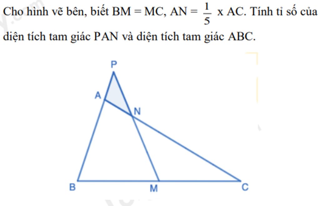Có SBNA = $\frac{1}{5}$ SBAC (Chung đường cao hạ từ B và AN = $\frac{1}{5}$ x AC)