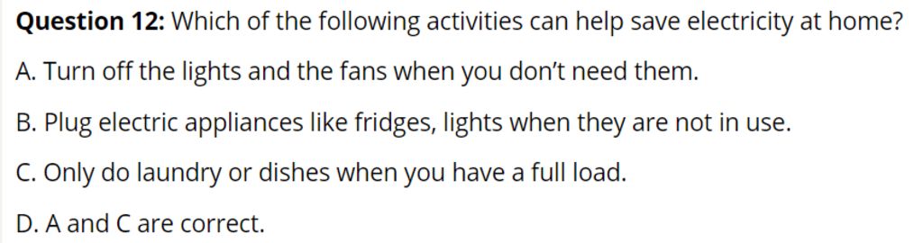 `->` Tạm dịch : Hoạt động nào sau đây có thể giúp tiết kiệm điện tại nhà ?