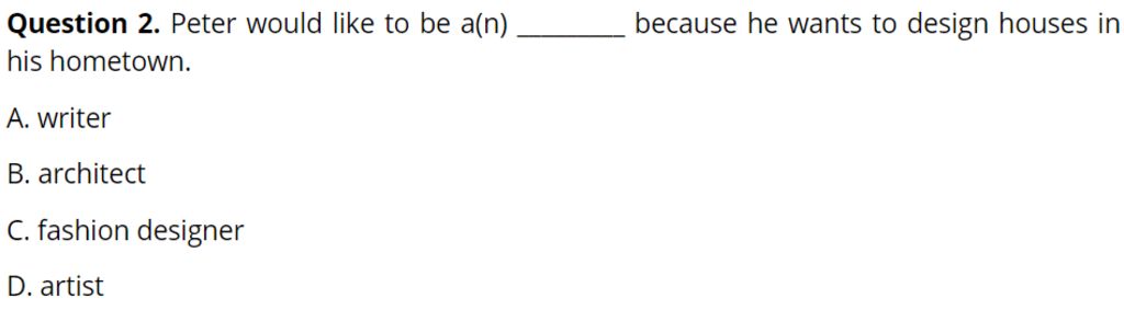 `->` Peter muốn trở thành một kỹ sử bởi vì cậu ấy muốn thiết kế nhà ở quê hương.