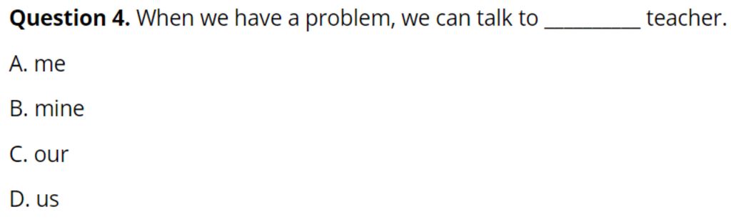 `->` Chọn "our" vì tính từ sở hữu của chủ ngữ "we" là "our"