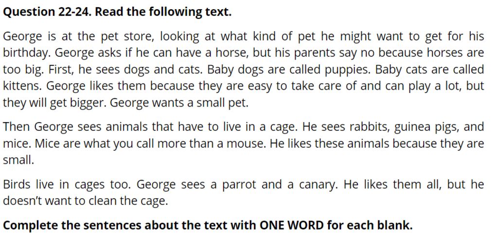 Explain: In the paragraph has two sentences that "Geogre is at the pet store, looking at what kind of pet he mights want to get for his birthday. Geogre asks if he can have a horse, but his parents say no because horses are too big"