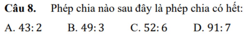 Câu 8. Phép chia nào sau đây là phép chia có hết: