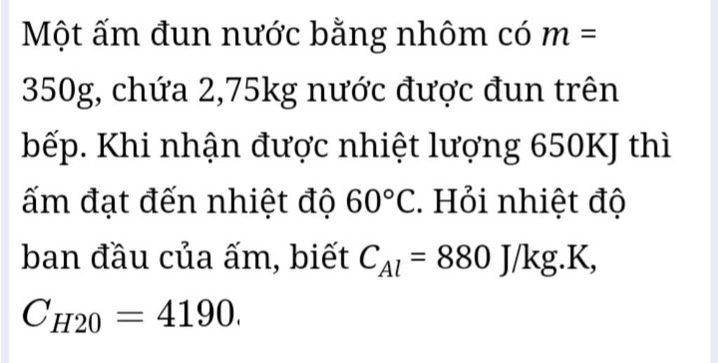 Đổi 350g = 0,35kg Q nước + Q nhôm = 650000 Gọi x là là nhiệt độ ban đầu của ấm nước <=> ( 2,75 . 4190 + 0,35 . 880 ). ( 60-x ) = 650000 => x = 5.1 độ C