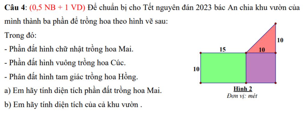 Câu 4: (0,5 NB + 1 VD) Để chuẩn bị cho Tết nguyên đán 2023 bác An chia khu vườn của mình thành ba phần để trồng hoa theo hình vẽ sau: