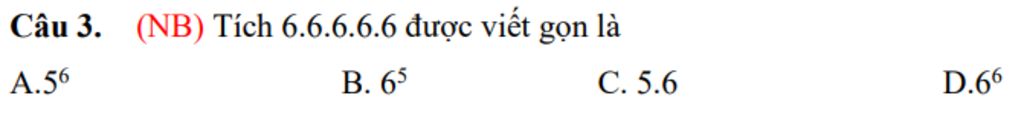 `->` Do đó, tích `6.6.6.6.6` được viết gọn là : `6.6.6.6.6=6^5`