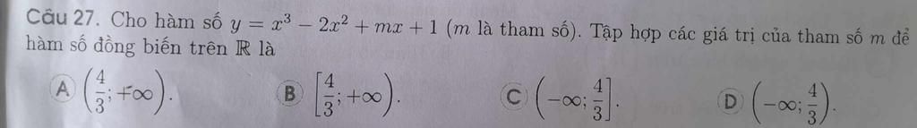 Giải thích các bước giải: Đạo hàm của hàm số là: y=3x²-4x+m.