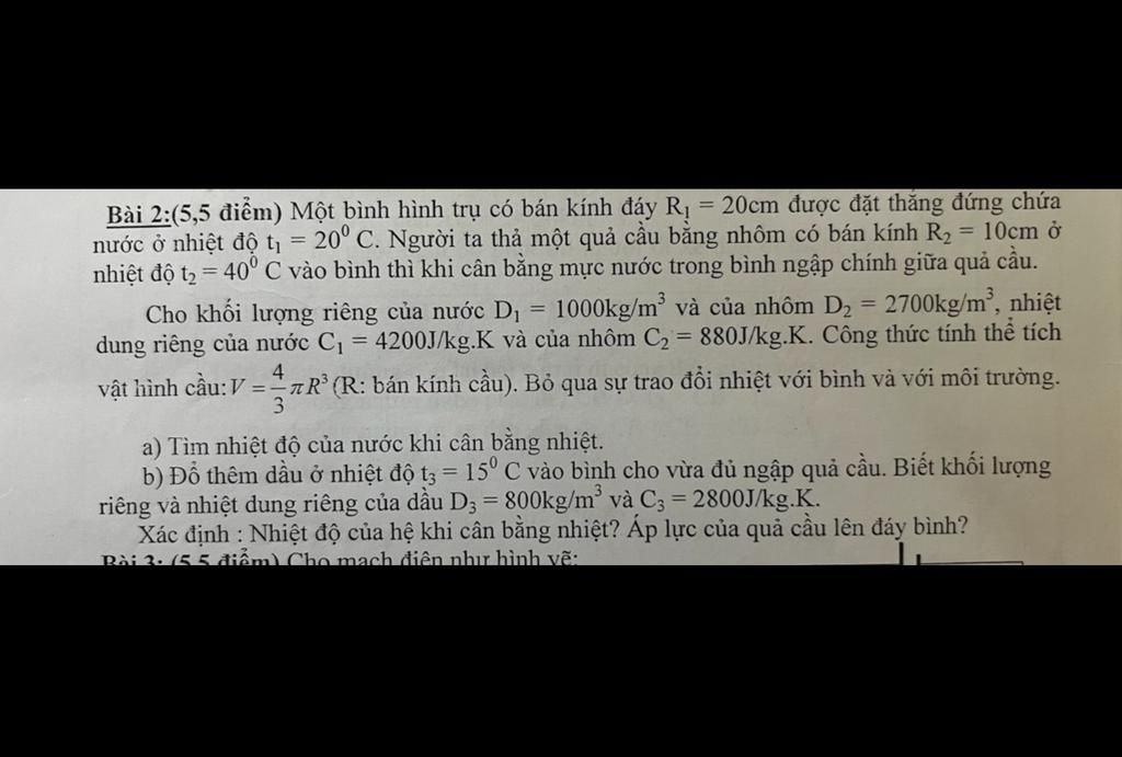 nước ở nhiệt độ t = 20° C. Người ta thả một quả cầu bằng nhôm có bán kính R, = 10cm ở