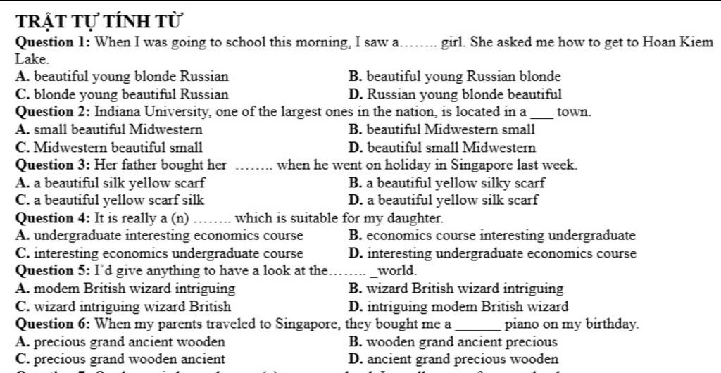 => Trật tự tính từ: Opinion -> Size -> Age -> Shape -> Color -> Origin -> Material -> Purpose (ý kiến -> kích cỡ -> tuổi -> hình dạng -> màu sắc -> xuất xứ -> chất liệu -> mục đích)