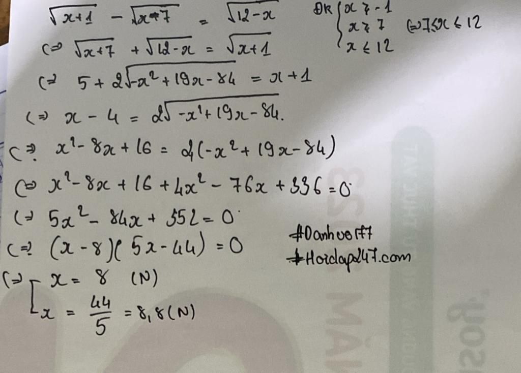 Đk: `x >= 7; x <= 12`