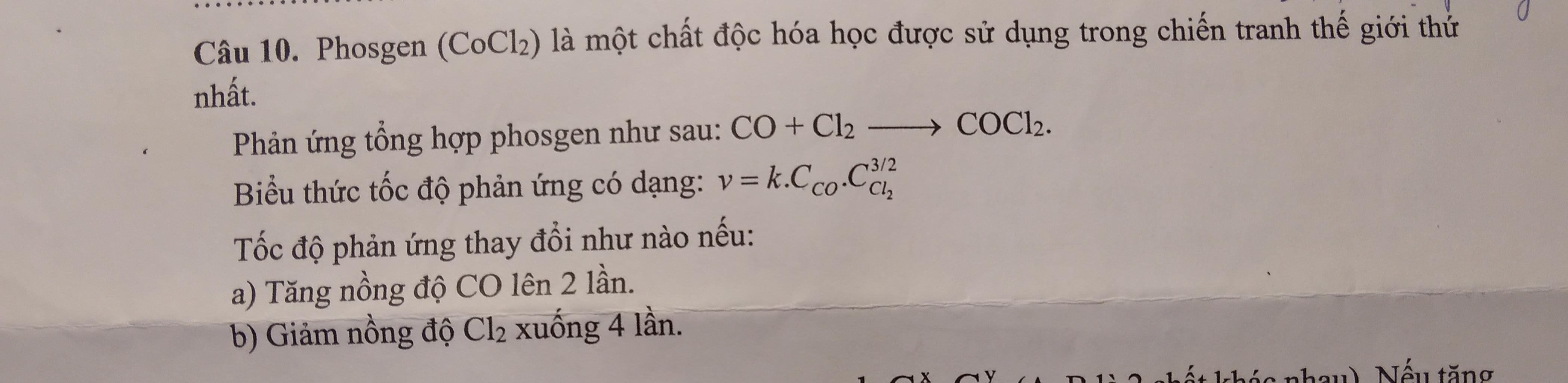 $\Rightarrow v_2=k.C_{CO}.(\dfrac{1}{4}C_{Cl_2})^{\dfrac{3}{2}}$