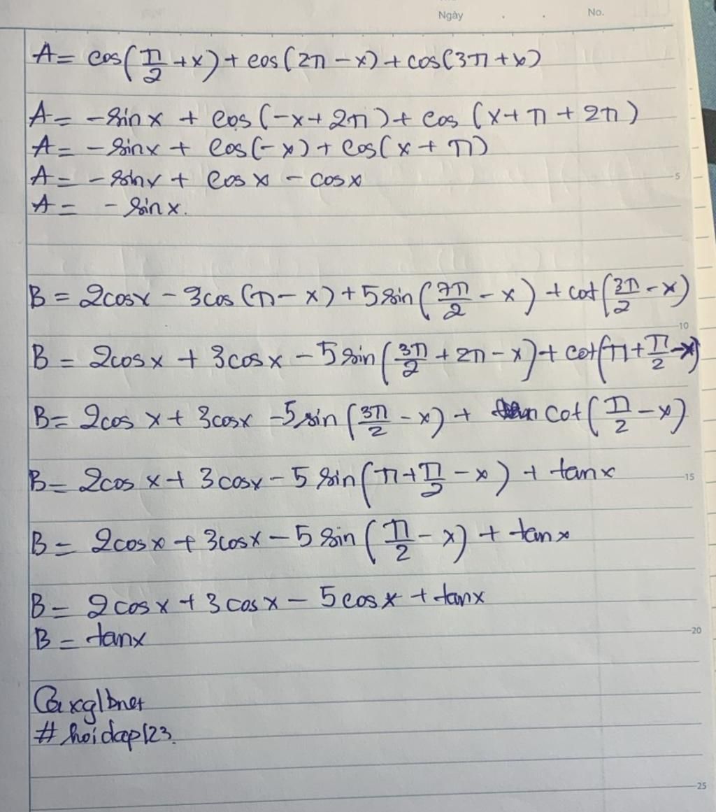 $B=2\cos x-3\cos(\pi-x)+5\sin(\dfrac72\pi-x)+\cot(\dfrac32\pi-x)$