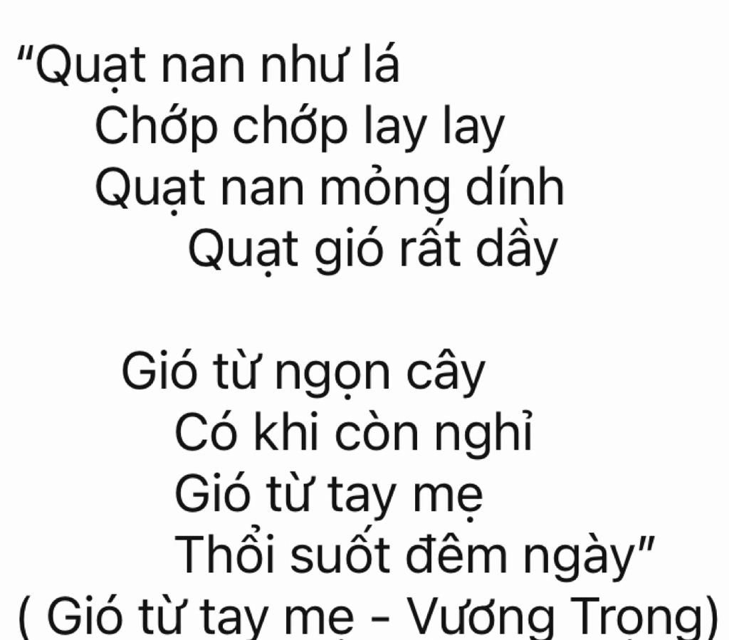 khổ thơ của nhà văn vương phạm đã mang đến cho khán giả rất nhiều cảm giác xúc động về mẹ đoạn thơ rất hay khi kể về người mẹ đang quạt cho con ngủ.
