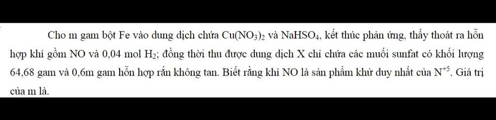 $Fe+\begin{cases} Cu(NO_3)_2: x\\ NaHSO_4: y\end{cases} \to \begin{cases} Na^+: y\\ Fe^{2+}\\ SO_4^{2-}:y\end{cases}+ \begin{cases} Fe\\ Cu\end{cases}+\begin{cases} NO\\ H_2: 0,04\end{cases}+ H_2O$
