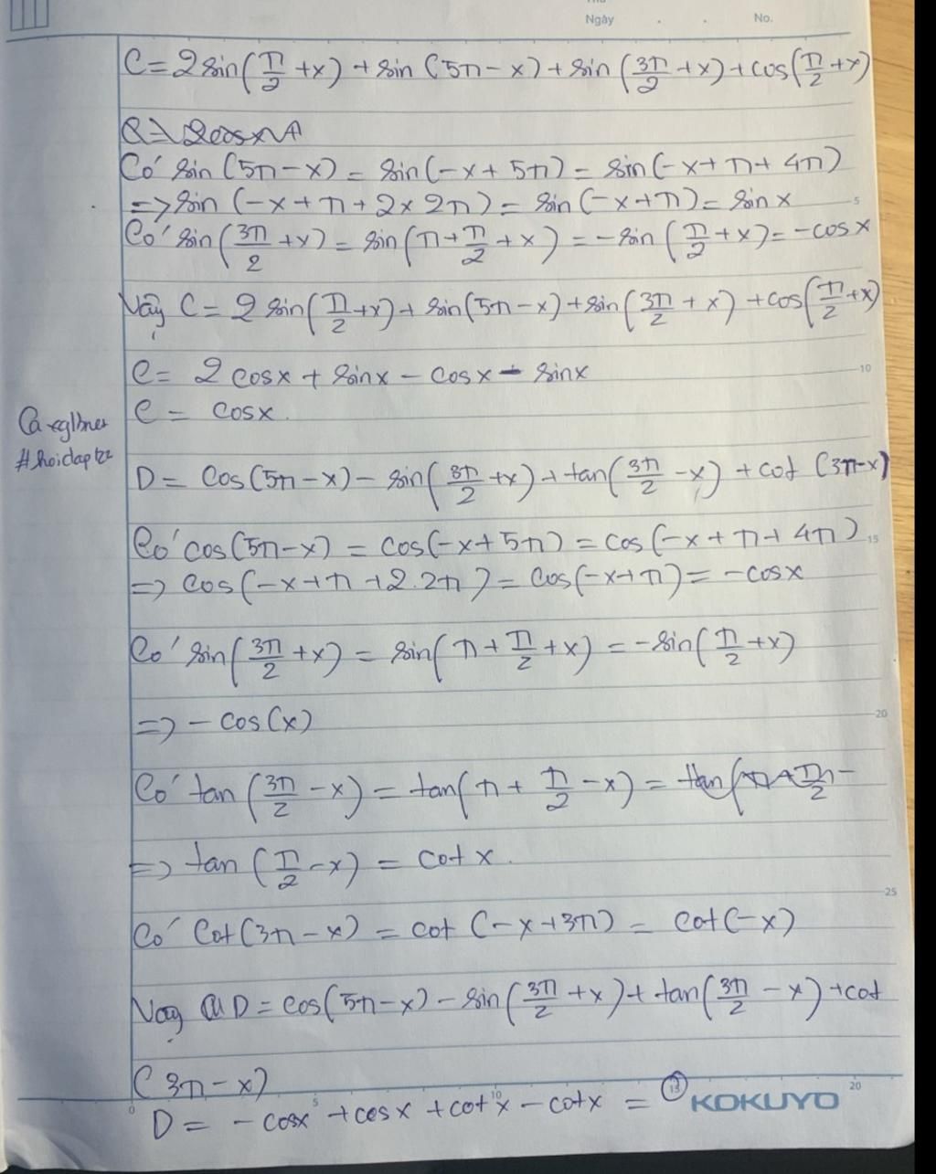 `D=cos(5pi-x)-sin((3pi)/2+x)+tan((3pi)/2-x)+cot(3pi-x)`