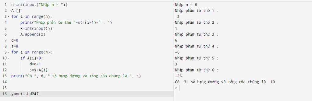 n=int(input("Nhập n = ")) A=[] for i in range(n): print("Nhập phần tử thứ "+str(i+1)+" : ") x=int(input()) A.append(x) d=0 s=0 for i in range(n): if A[i]>0: d=d+1 s=s+A[i] print("Có ", d, " số hạng dương và tổng của chúng là ", s) `to` n = int(input()) ds = [int(input()) for i in range(n)] print(sum(1 for i in ds if i>0)) print(sum(i for i in ds if i>0)) Rút gọnn=int(input("Nhập n = ")) A=[] for i in range(n): print("Nhập phần tử thứ "+str(i+1)+" : ") x=int(input()) A.append(x) d=0 s=0 for i in range(n): if A[i]>0: d=d+1 s=s+A[i] print("Có ", d, " số hạng dương và tổng của chún... xem thêm