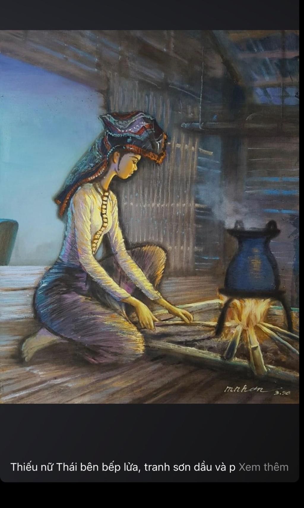 Bức tranh này vẽ người đồng bào dân tộc. Ngôi nhà ở đầy là một ngôi nhà sàn. Cảnh đang vẽ một cô gái đang ngồi cạnh bên bếp lửa. Em cảm nhận đc ở đây cái trang phục , trang phục giản dị của người đồng bào dân tộc và cảnh ngôi nhà sàn đơn sơ mộc mạc. Họa sĩ đã tô cho chiếc váy của cô gái và cái khăn đội đầu bằng rất nhiều màu sắc thể hiện để khâu ra một thành phẩm như thế rất phức tạp cầu kì có thể mất đến 1 năm. Họa sĩ đã vẽ cảnh bếp lửa rất sống động và chân thật. Bức tranh gợi cho em cảm giác mộc mạc đơn xơ cảu người đồng bào dân tộc.