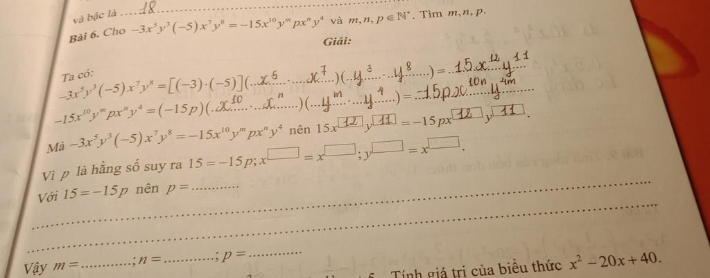 gài 6. Cho –3xy*(-5)ry =–15r"p" px"y" và m,n,peN. Tìm m,n,p.