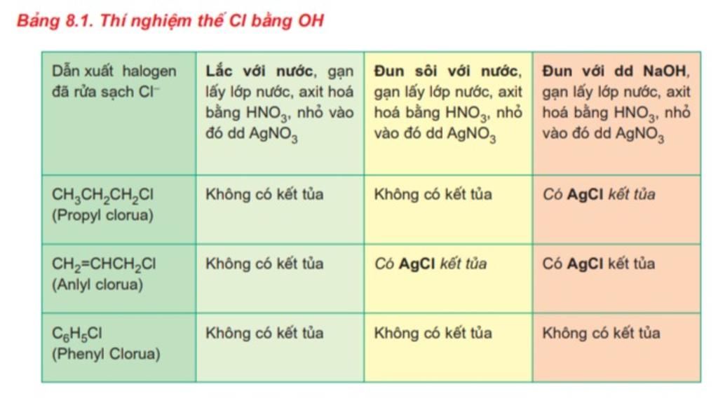 Dẫn xuất halogen có nguyên tử halogen liên kết trực tiếp với cacbon trong liên kết đôi hoặc với vòng benzen là các dẫn xuất halogen khó tham gia phản ứng thế nhất nên phenyl clorua không phản ứng ngay cả khi đun trong dung dịch $NaOH$ nên nhỏ $AgNO_3$ vào không thấy có kết tủa xuất hiện ở cả ba phản ứng. Dẫn xuất loại này chỉ tác dụng với kiềm đặc nóng hoặc nóng chảy, ở áp suất và nhiệt độ cao.