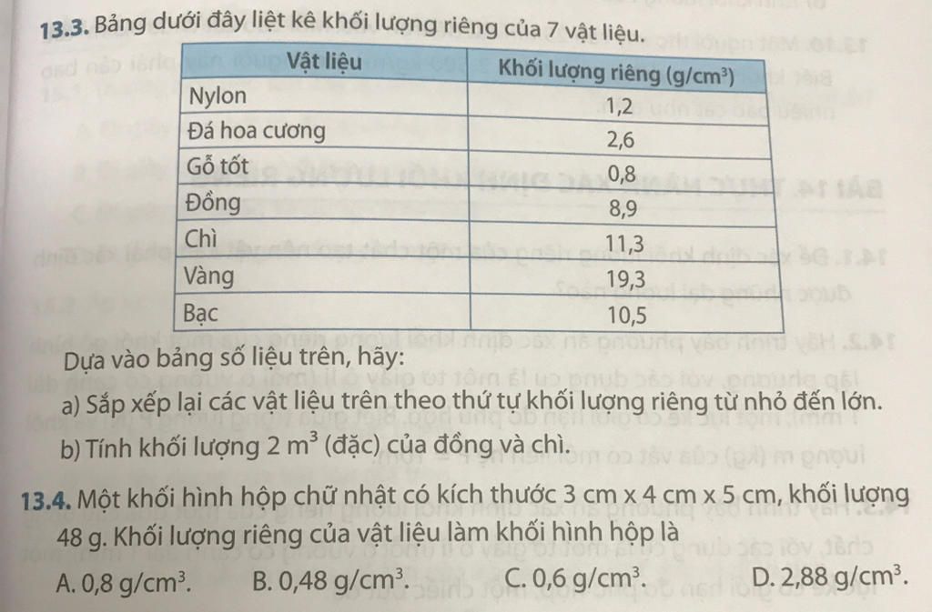 a) Để sắp xếp lại các vật liệu theo thứ tự khối lượng riêng từ nhỏ đến lớn, ta có: