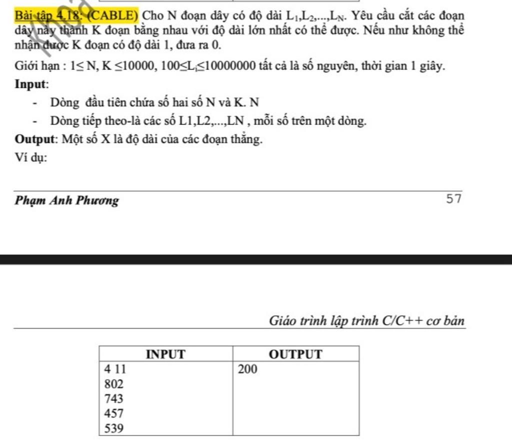 dây này thành K đoạn bằng nhau với độ dài lớn nhất có thể được. Nếu như không thể